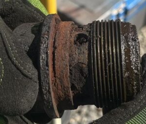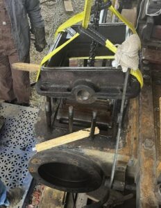 Our contracted experts, Steam Operations returned to Bonsal February 26 to March 5. The plan was to weld repairs to water side of front and rear flue sheets, true up tube holes at the patch on front flue sheet, weld repairs to branch pipe(s), begin disassembly of steam chests to inspect valves, seats and related components and attempt to test operate the steam air compressor on air pressure. The branch pipes had some old repairs which were removed and will be sent off to get fresh, stronger repairs accomplished. [The branch pipes carry live steam from the boiler to the valves and pistons on each side – ed.]