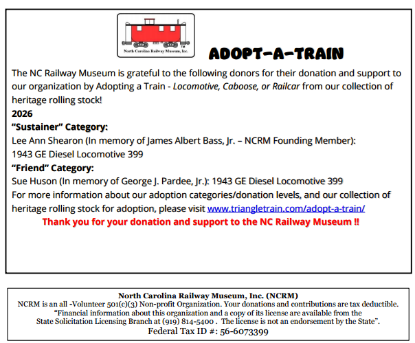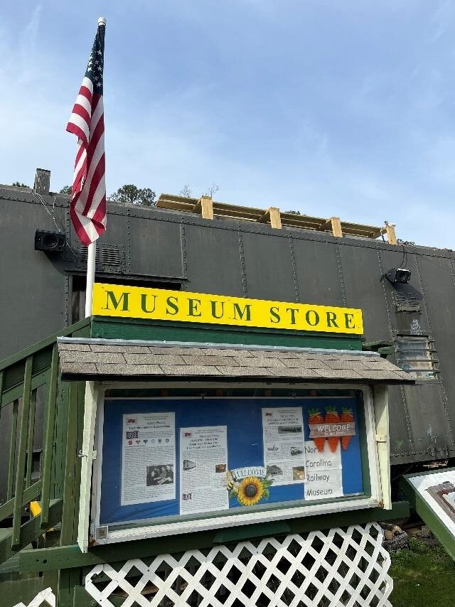 One of our favorite attractions, at least for the kids and the railfans, is our Gift Shop. We are always receiving new items for sale from toys and wooden train whistles to collectable pins, shirts and a HUGE library of slightly used railroad books. We also have quite a display of historic North Carolina Rail-related memorabilia (courtesy of the late Tim Carroll) and a few other railrelated items from around the country and the world. Now, we have a bran-new sign, thanks to Marco Zarate! Please remember to recommend a visit to our shop at the end of each ride or when you welcome visitors to our parking lot.