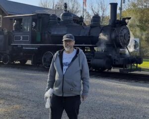 Long-time NCRM member Scott McElwaine passed away at the age of 67 on 2 December 2025. He is survived by his wife, Tammy, children Jenifer, Robert and Christopher, his brother, David, sister, Heather Flowers, and aunt, Lova. He was an active church member and youth mentor for decades. Scott joined the NCRM in 2007 and served as a car host/brakeman and parking attendant. He always had a big smile and kind word for all our members he worked with. He was very good with kids and always had time to listen to whatever our younger members wished to share with him. Scott was also a bigtime steam fan, from his HO scale model trains, to live steam (pictured at right) and the full-sized locomotives, like our locomotive 17. He was well-liked and respected and he will be greatly missed around Bonsal.